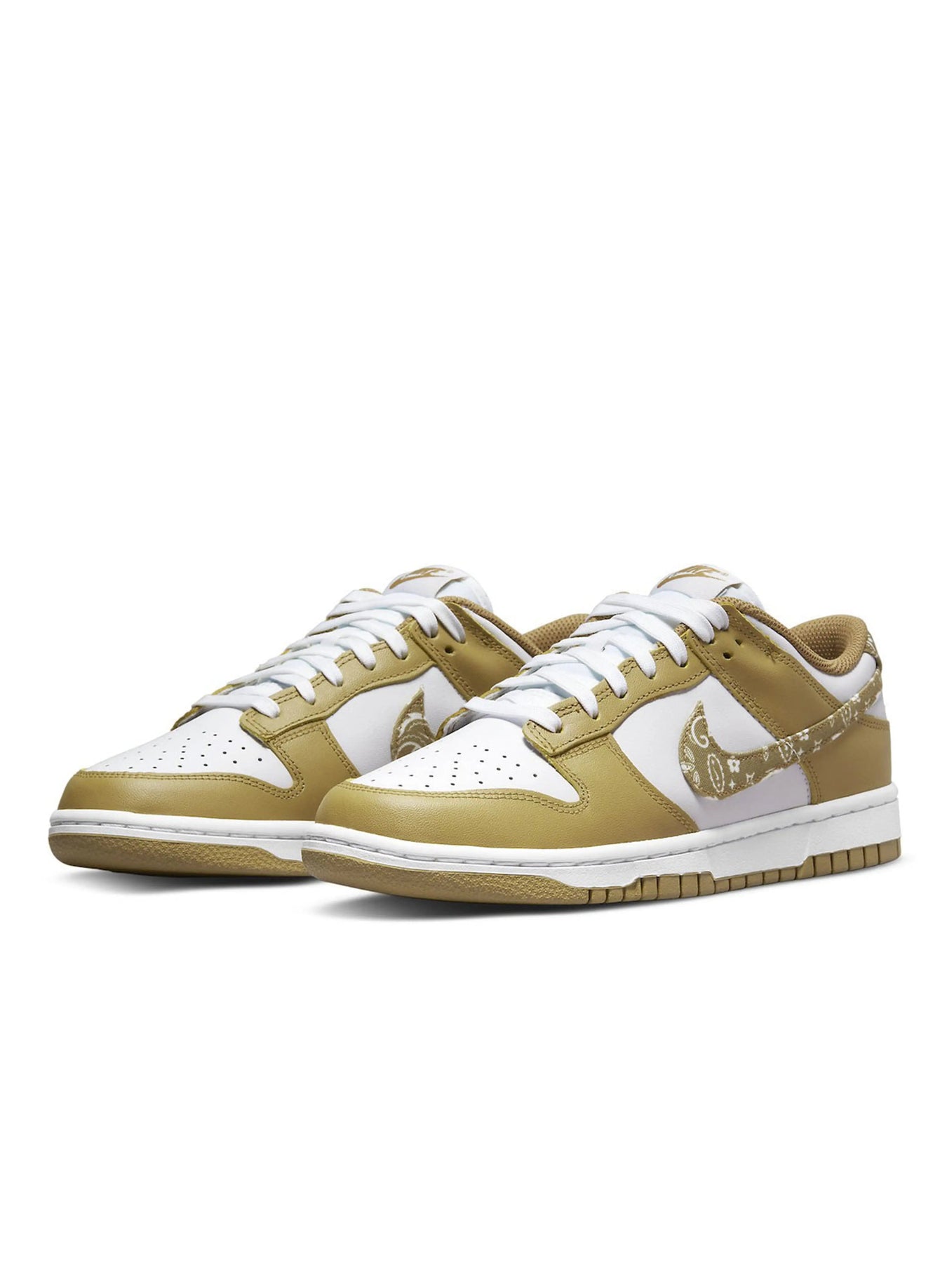 The Nike Dunk Low Essential Paisley Pack Barley also has a white tongue and white shoelaces. The shoe’s logo is printed on the tongue in a barley color.