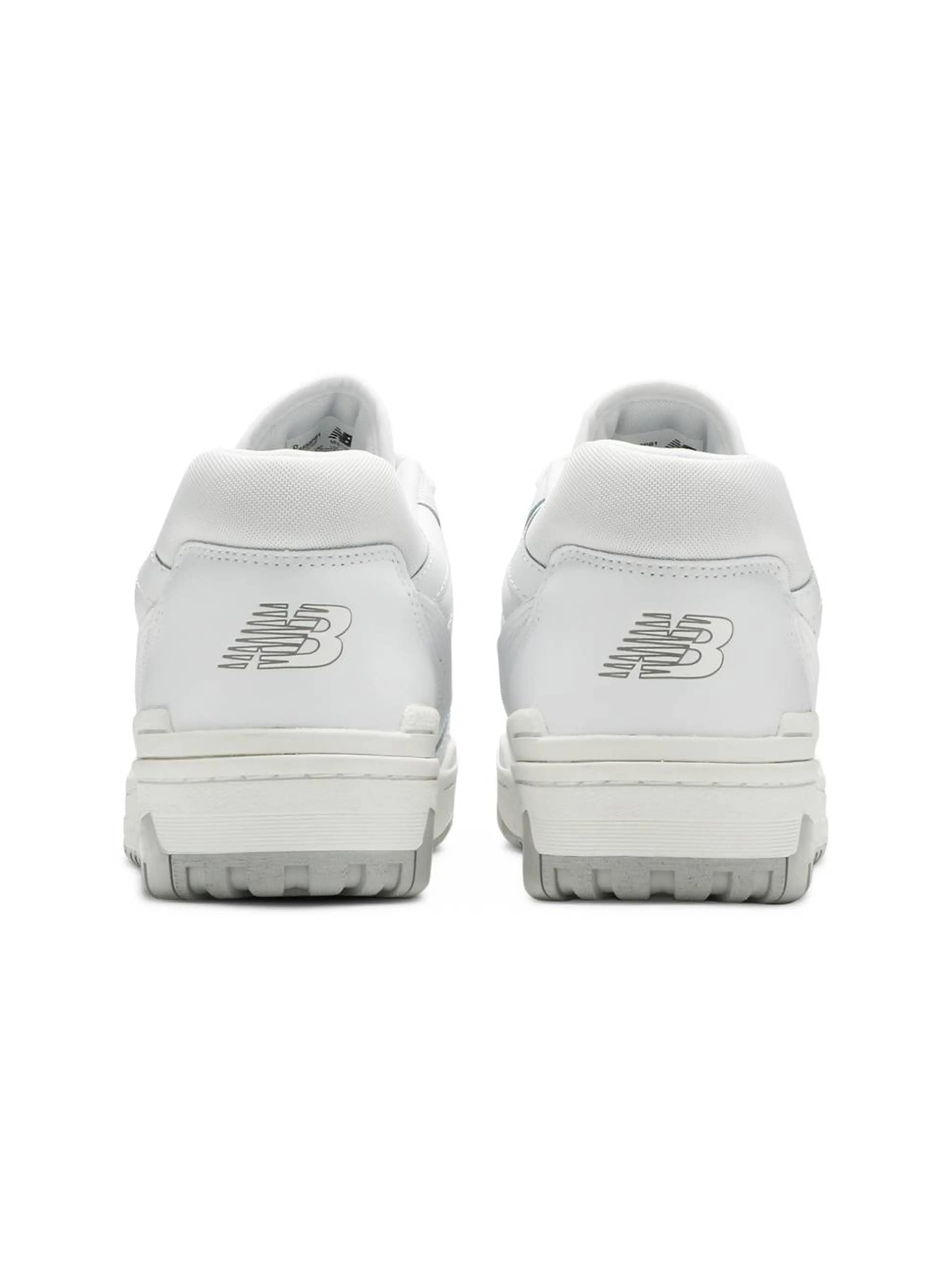 The New Balance 550 White Grey features a white leather upper with monochromatic perforated leather overlays and puffed New Balance logos. From there, a woven New Balance Basketball tongue label and matching sole completes the design.