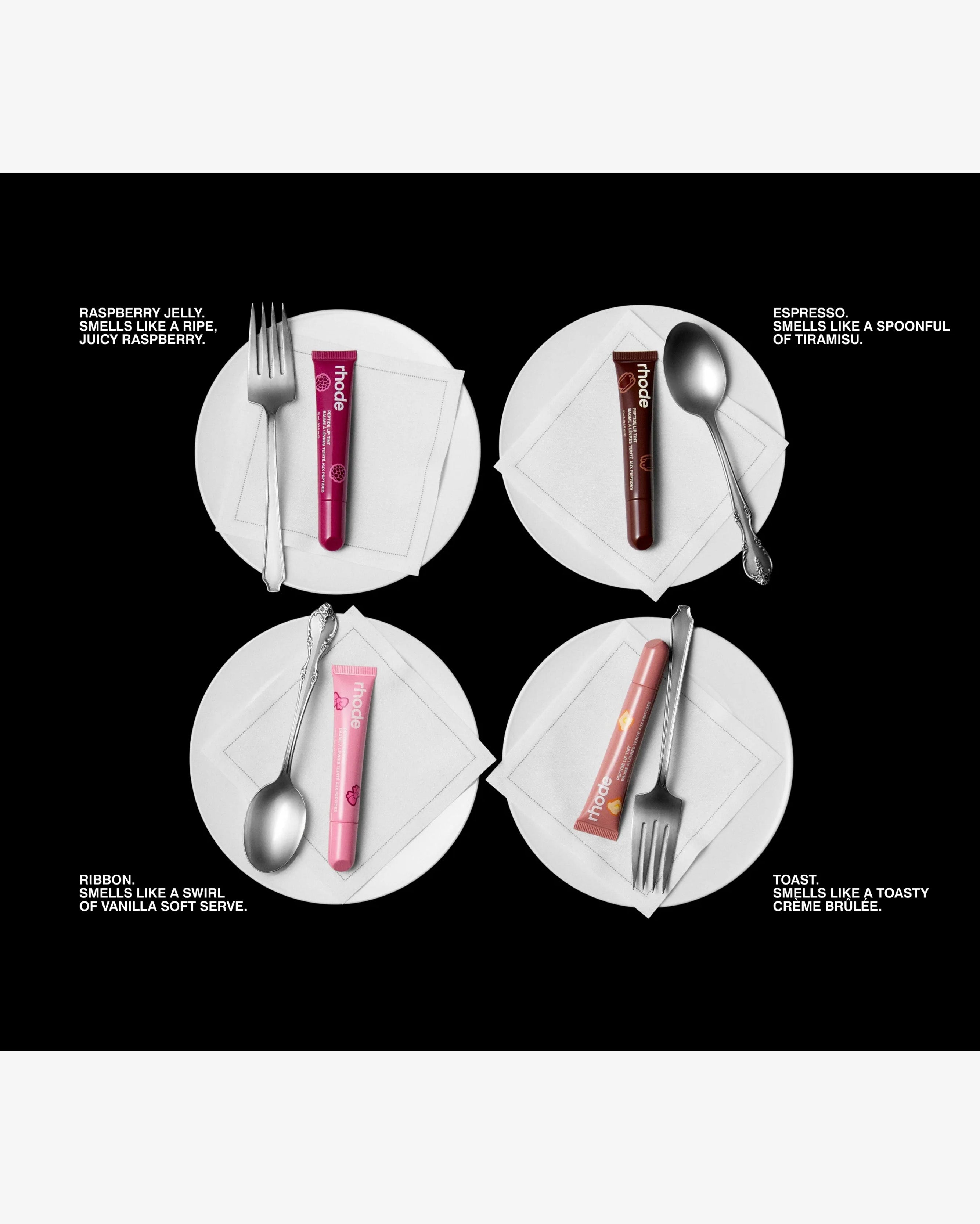 Includes: All four limited edition Scented Peptide Lip Tints in Ribbon, Toast, Raspberry Jelly, Espresso