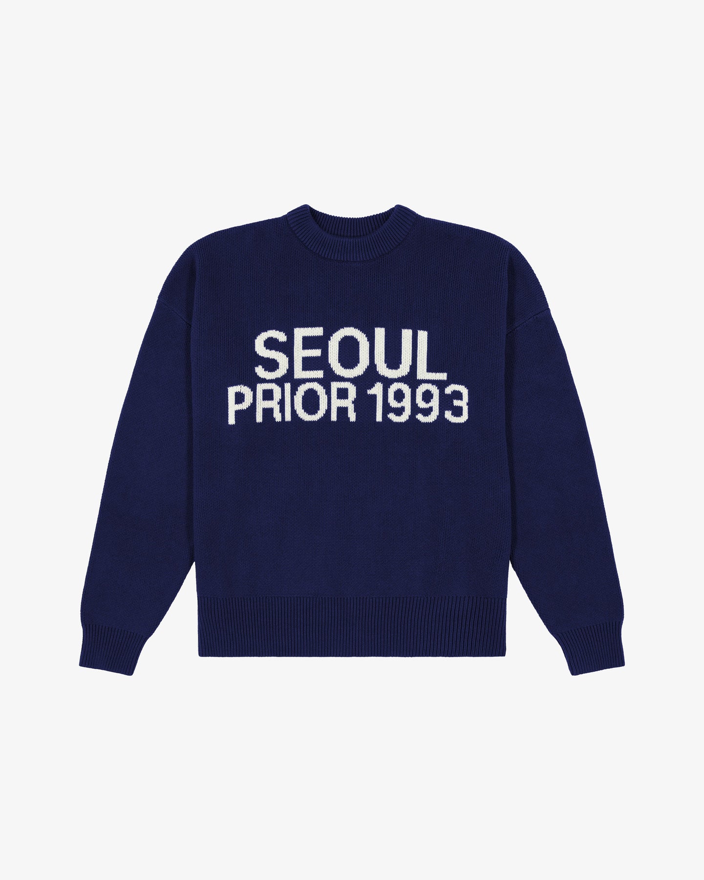 A considered approach to seasonal layering. Crafted from 100% organic cotton, this sweater offers a structured yet soft hand feel, balanced with a signature thick waistband designed to sit cropped or relaxed. The intarsia “Seoul 1993” chest detail references the collection’s origin and narrative-our ode to home.
